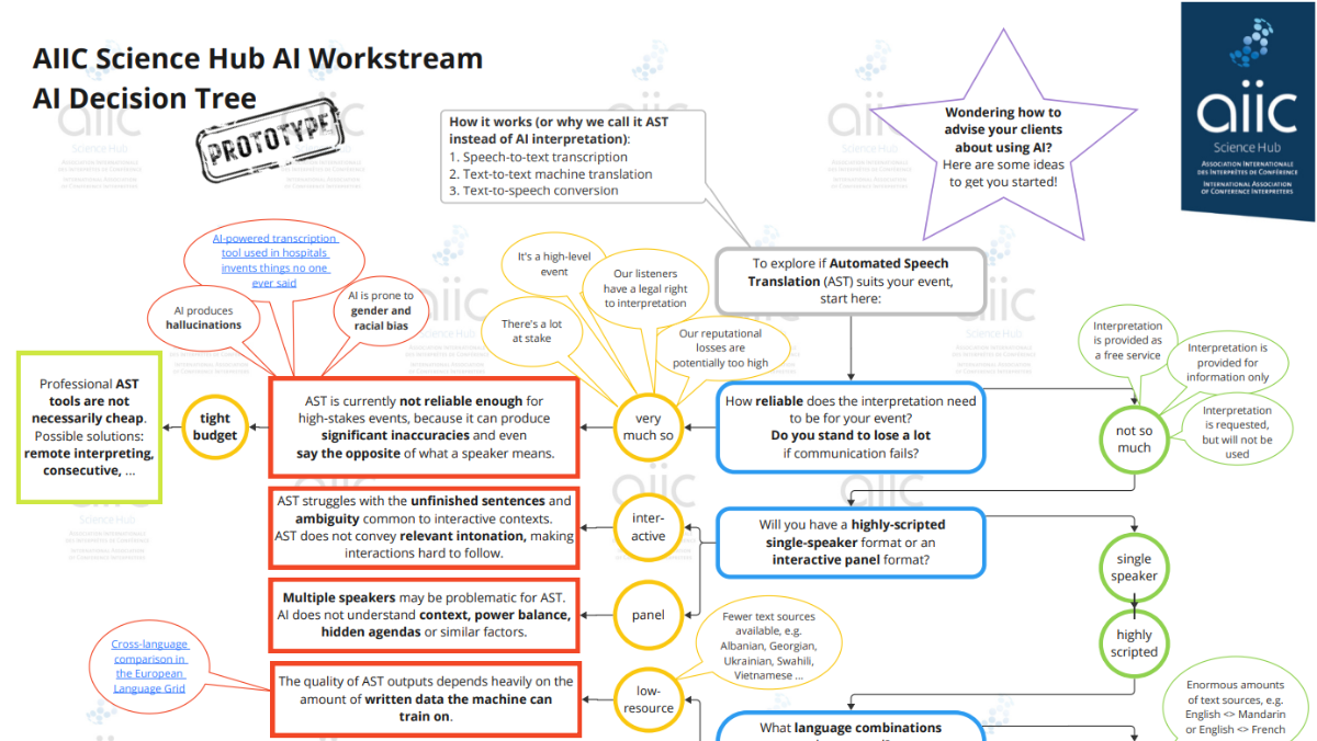 That’s why the AIIC Science Hub AI Workstream, a group that monitors and responds to AI’s impact on interpreting, has developed a resource called the AI Decision Tree.